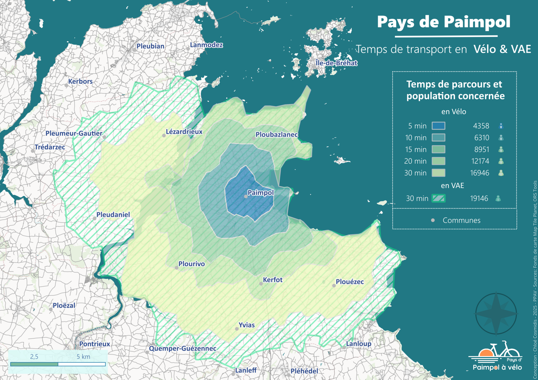 19.000 personnes vivent à moins de 30 minutes en vélo électrique du centre de Paimpol.5, 10, 20 ou 30 minutes ? Visualisez sur cette carte quel temps de trajet vous mettrez au départ ou pour rejoindre Paimpol. Merci à Chloé pour la réalisation de cette jolie carte 😊